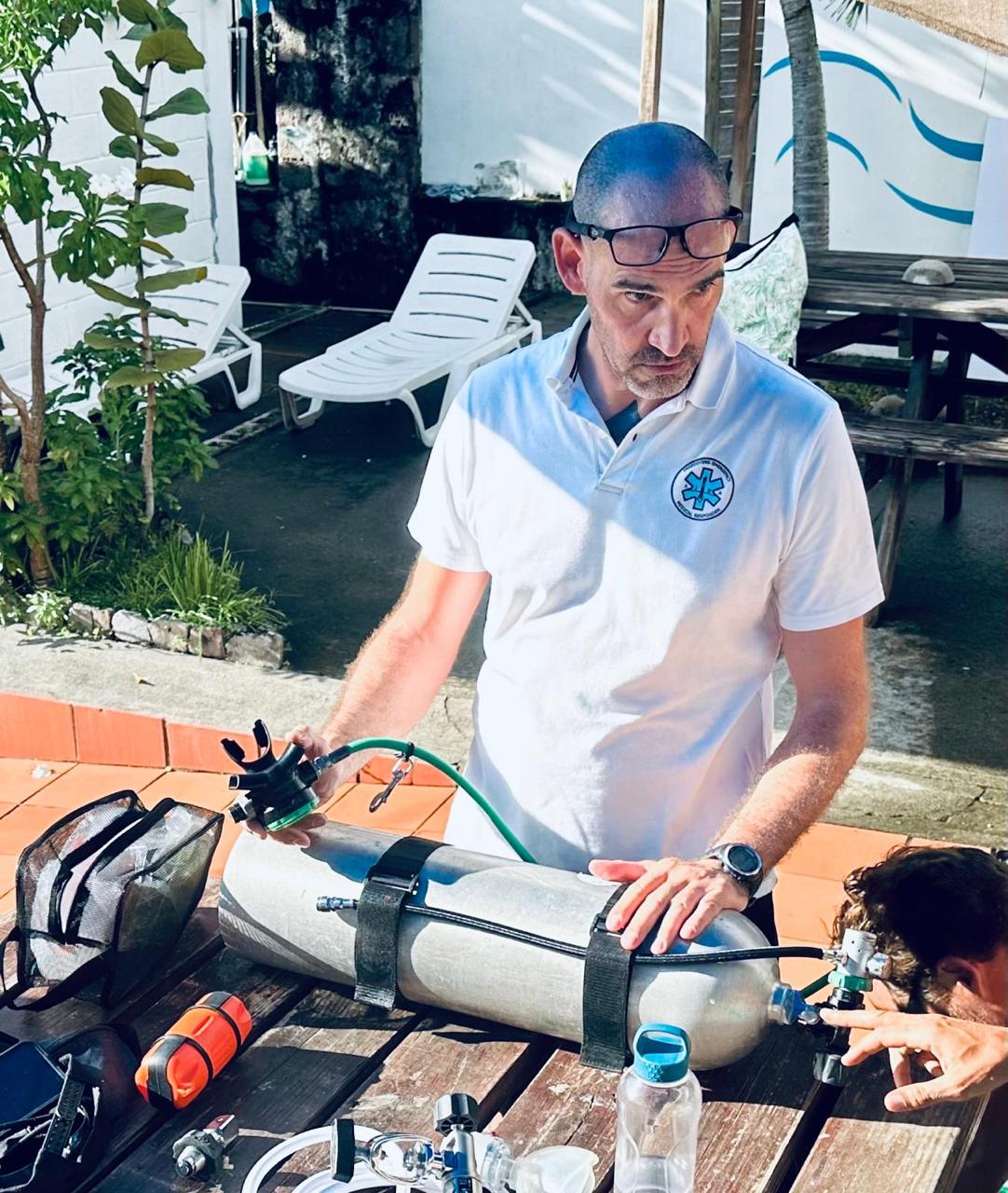 His expertise is broad: intensive care nurse, former ambulance driver, lifeguard. He’s also an instructor and instructor trainer for DAN (Divers Alert Network), teaching modules from BLSD to Oxygen, First Aid, Neurologic Assessment, Hazardous of Marine Life, and advanced topics. “I’m one of only three Diver Medical Technician instructors for DAN worldwide,” he notes.